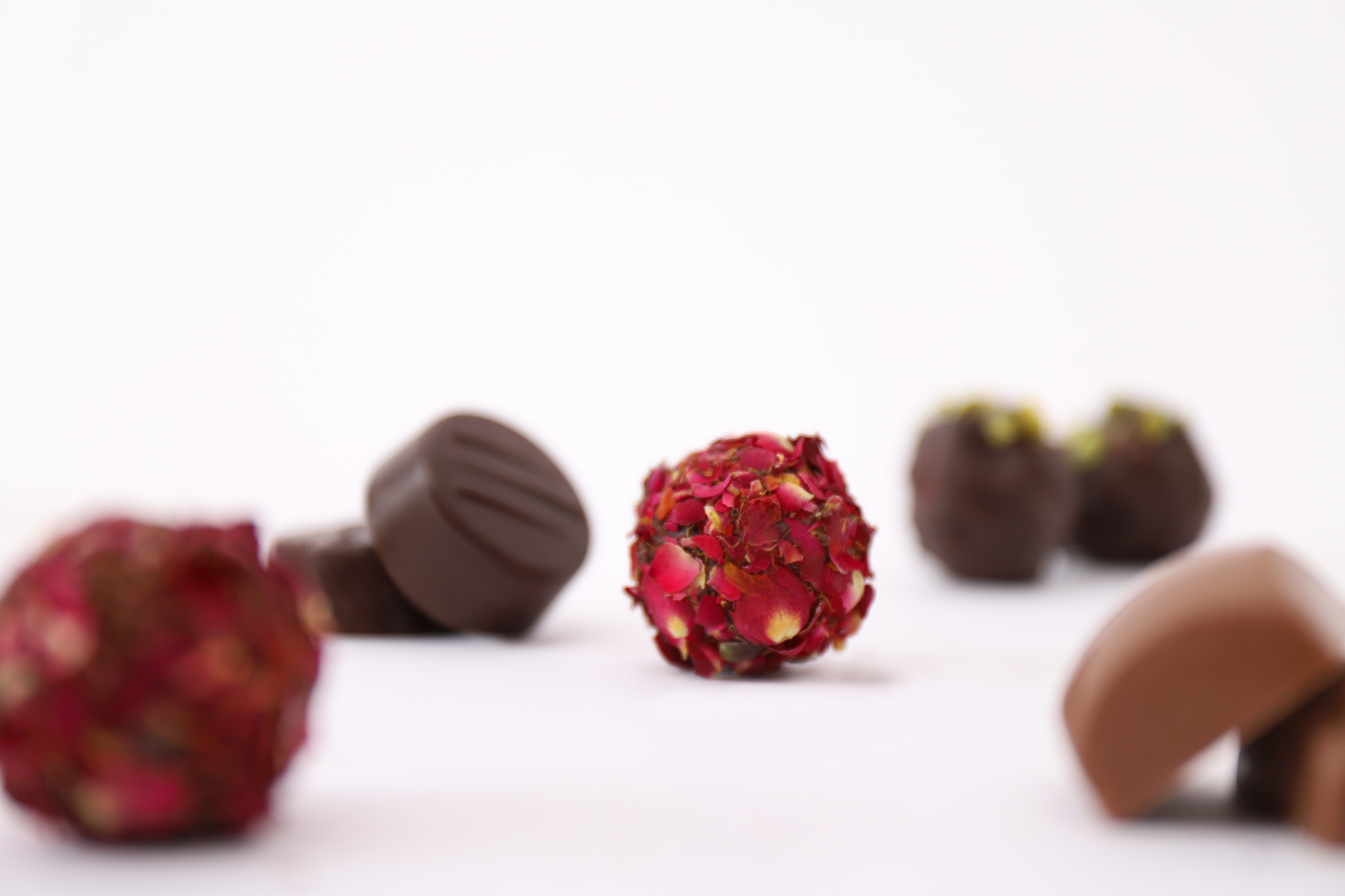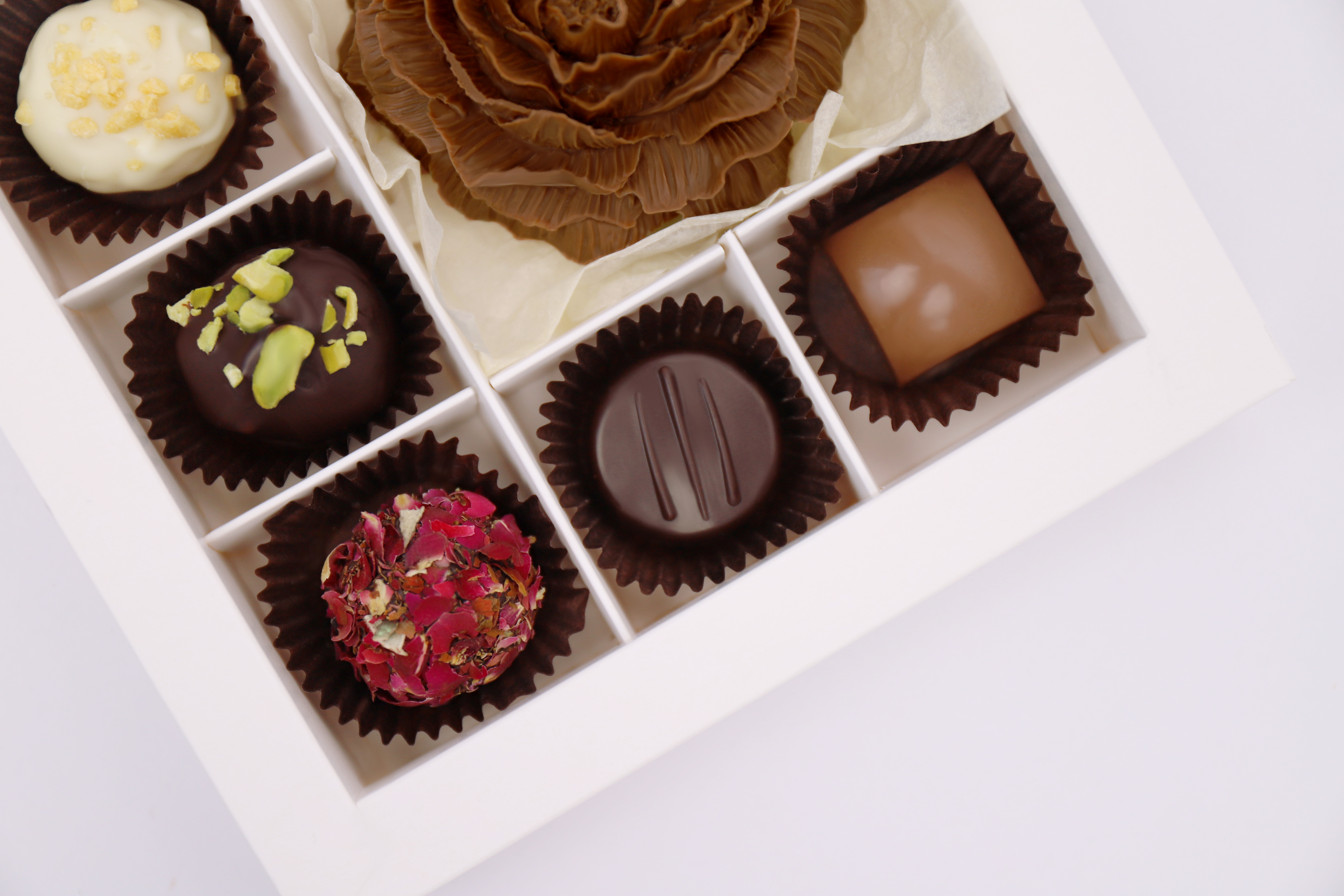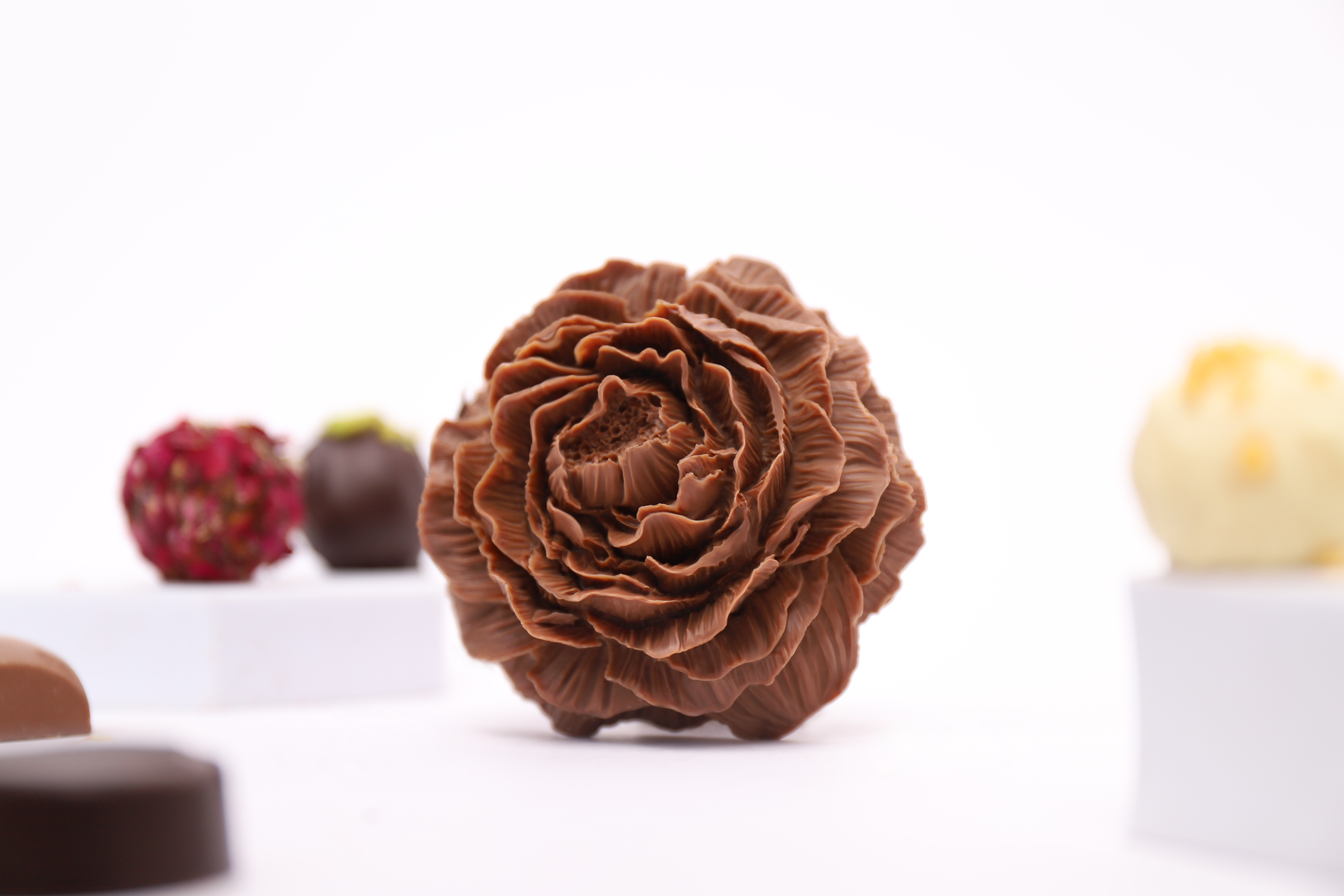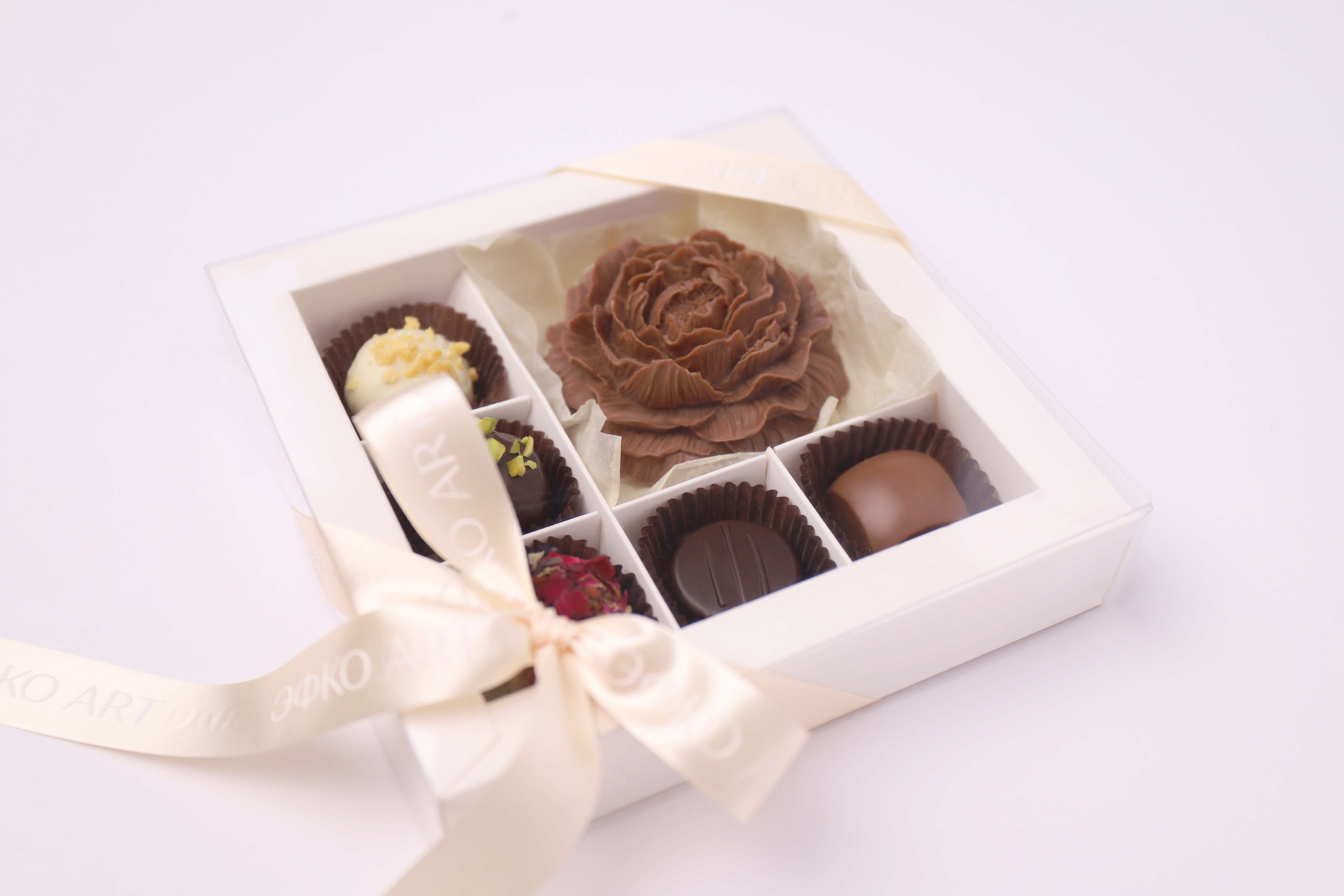 Фигура из молочного шоколада, конфеты: «Фисташка с чаем матча», «Манго-маракуйя», «Карамельный бейлиз», «Египетская ночь», «Чёрная смородина»