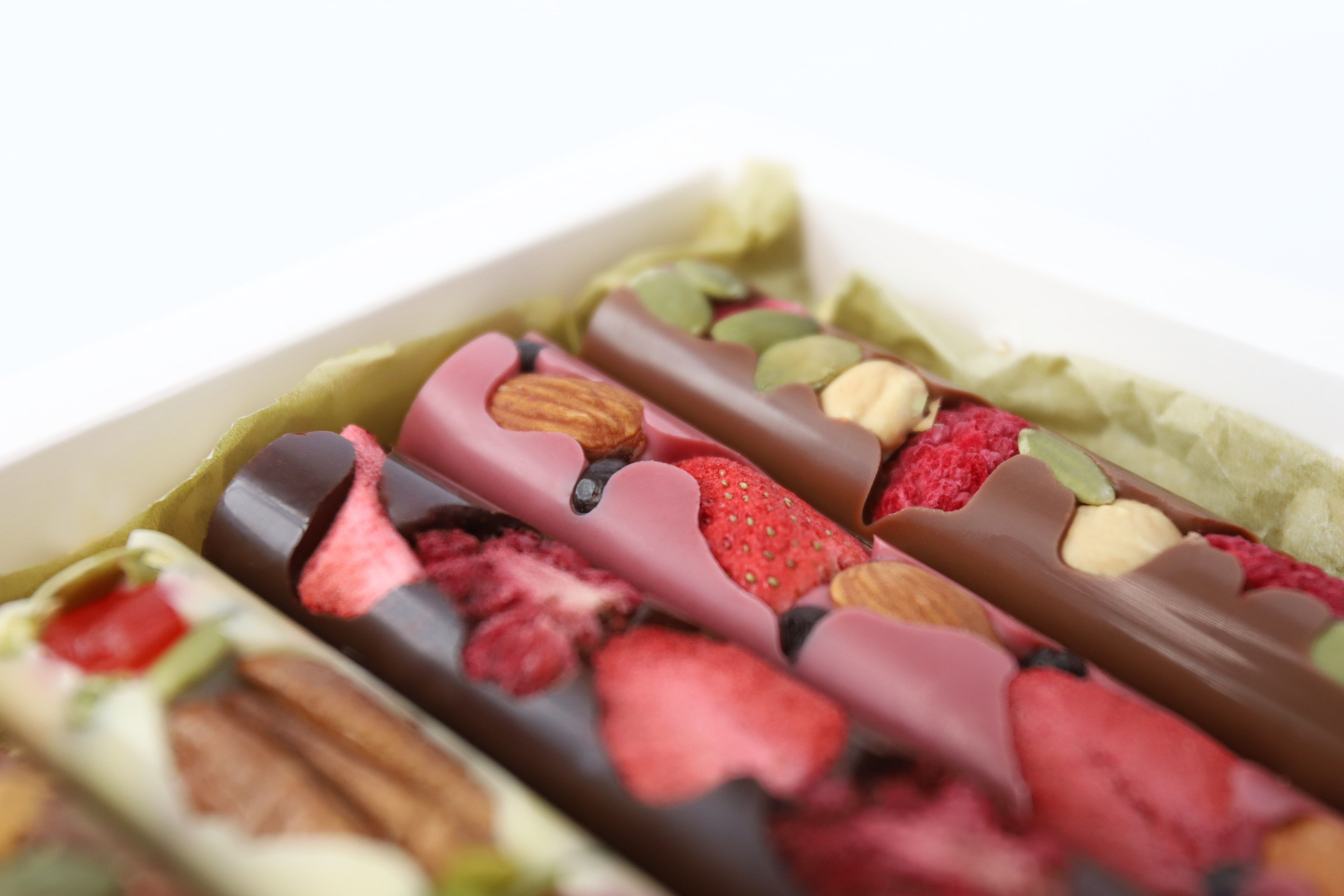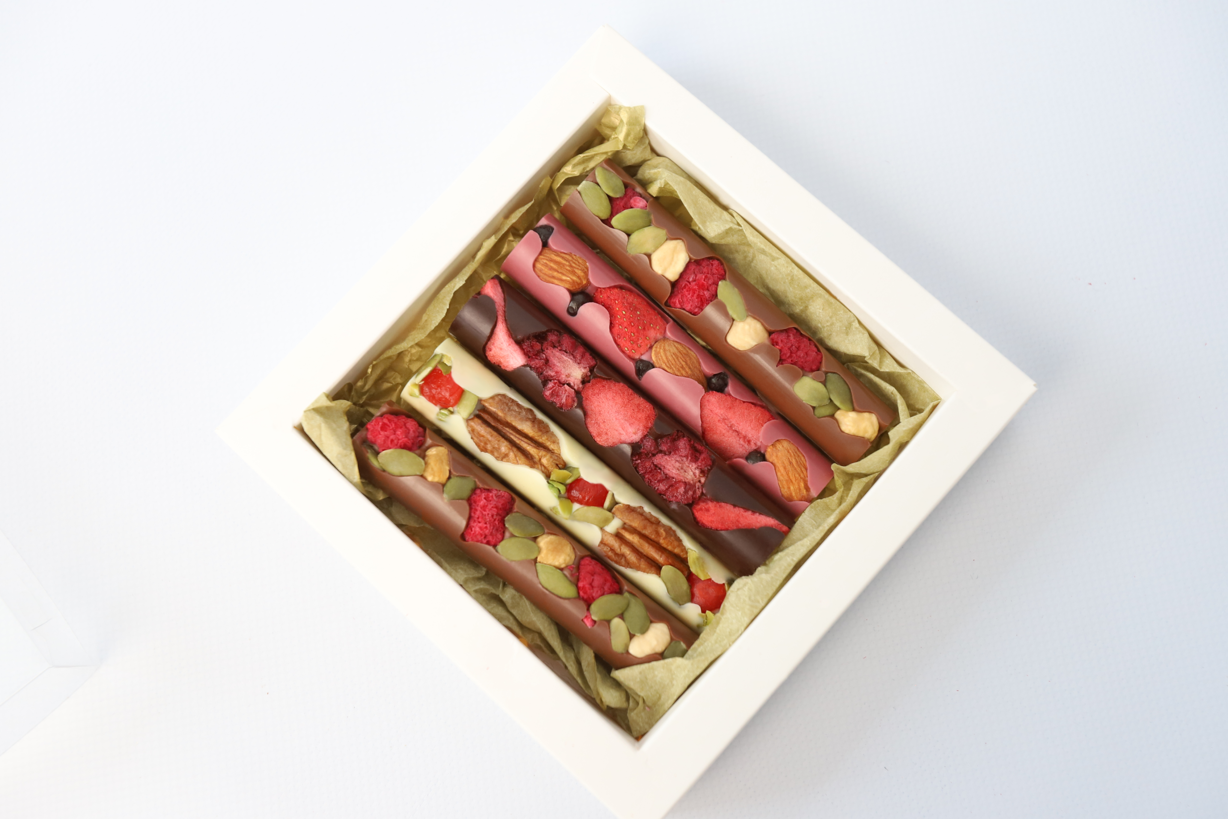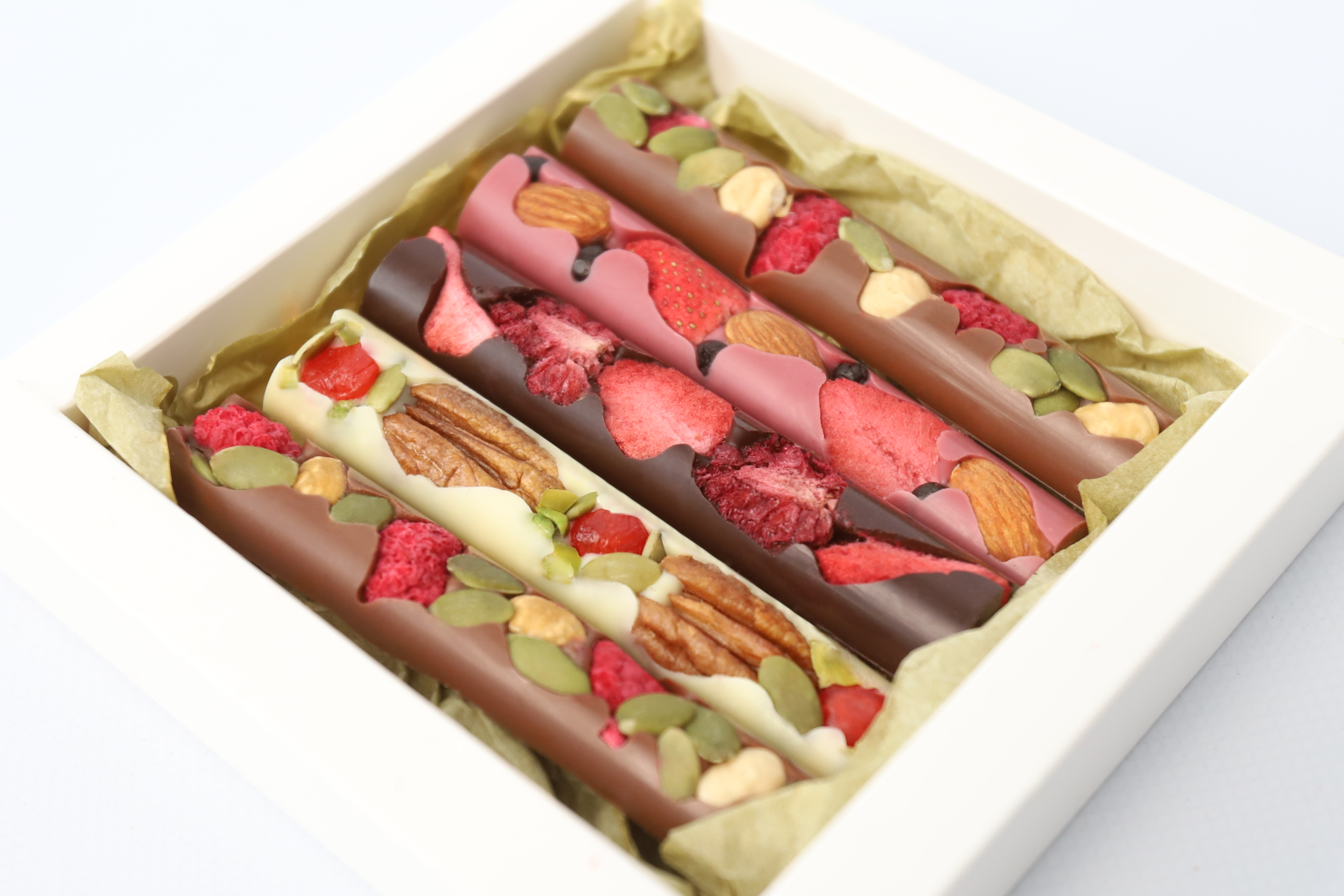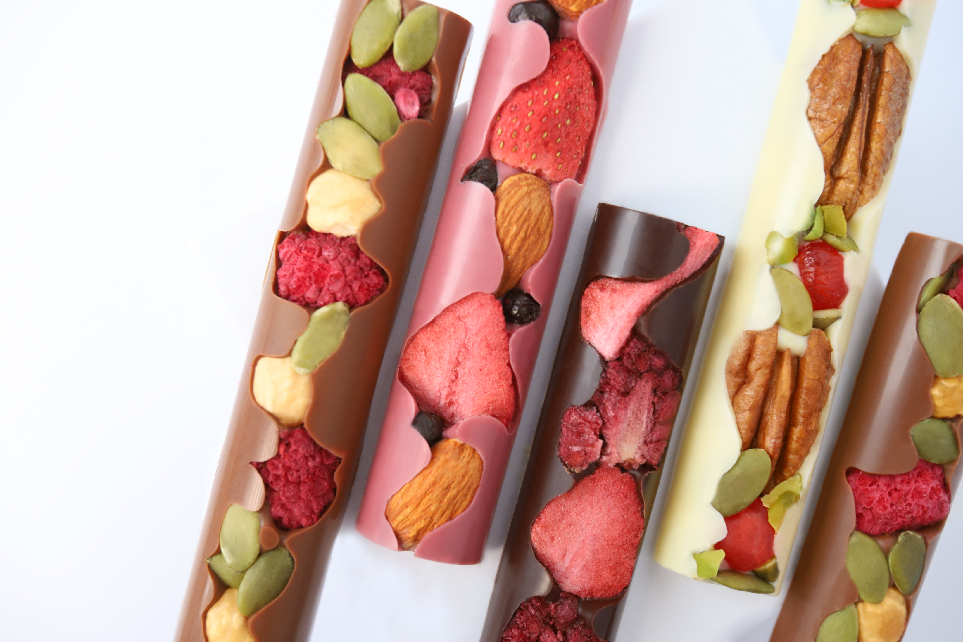 Молочный, горький, белый и рубиновый шоколад, фундук, пекан, фисташка, вяленая клюква, тыквенные семечки, сублимированная малина, клубника и ежевика