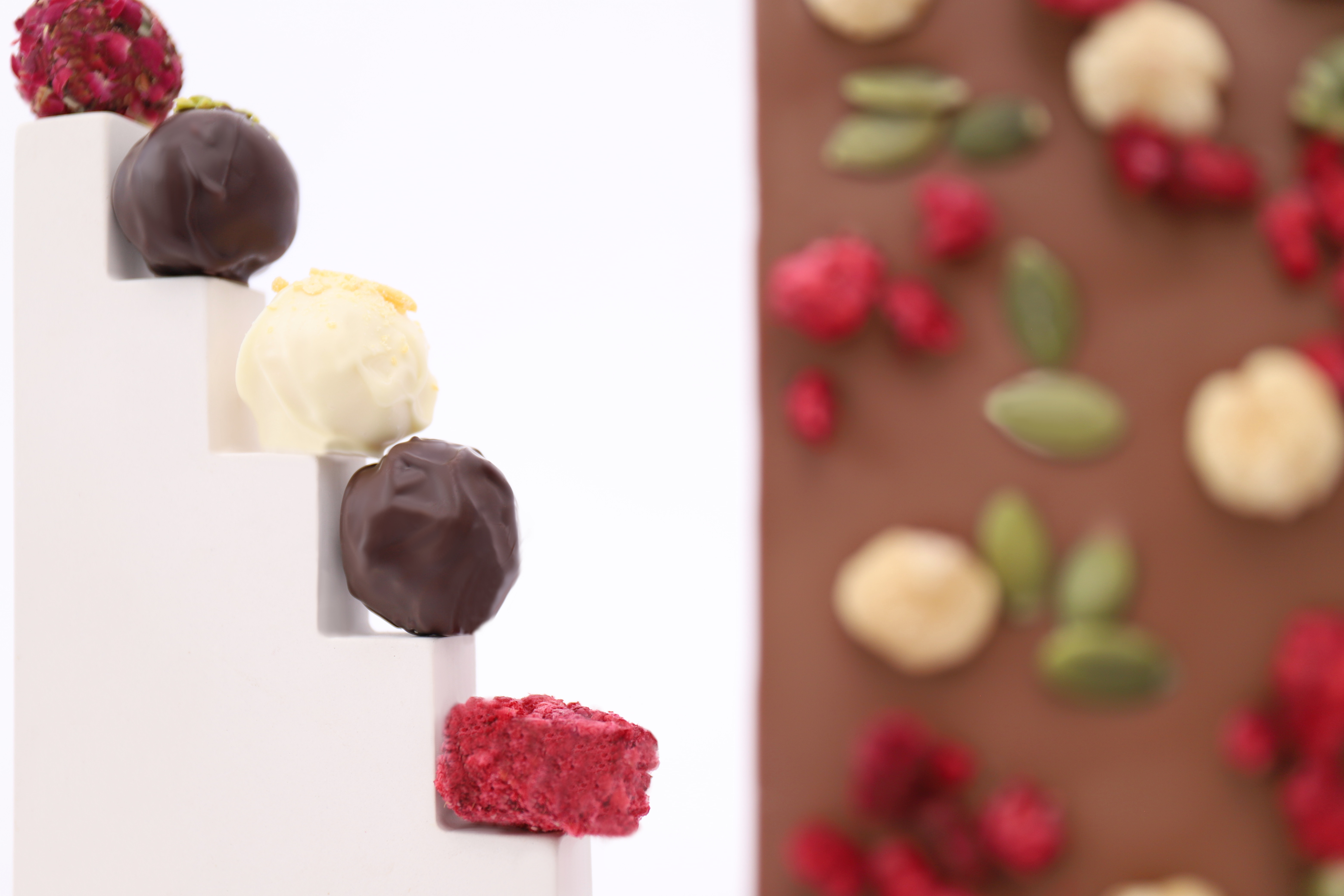 Шоколад молочный, конфеты: «Манго-маракуйя», «Карамельный бейлиз», «Чёрная смородина», «Фисташковая», «Фисташка с чаем матча», «Эрл Грей», «Пряная малина», «Марципан малина»