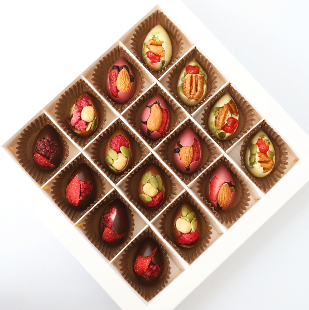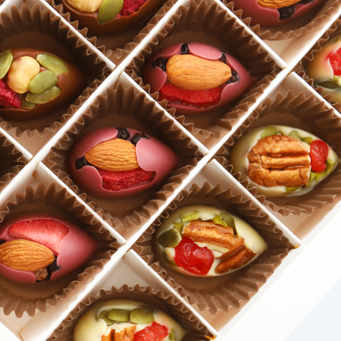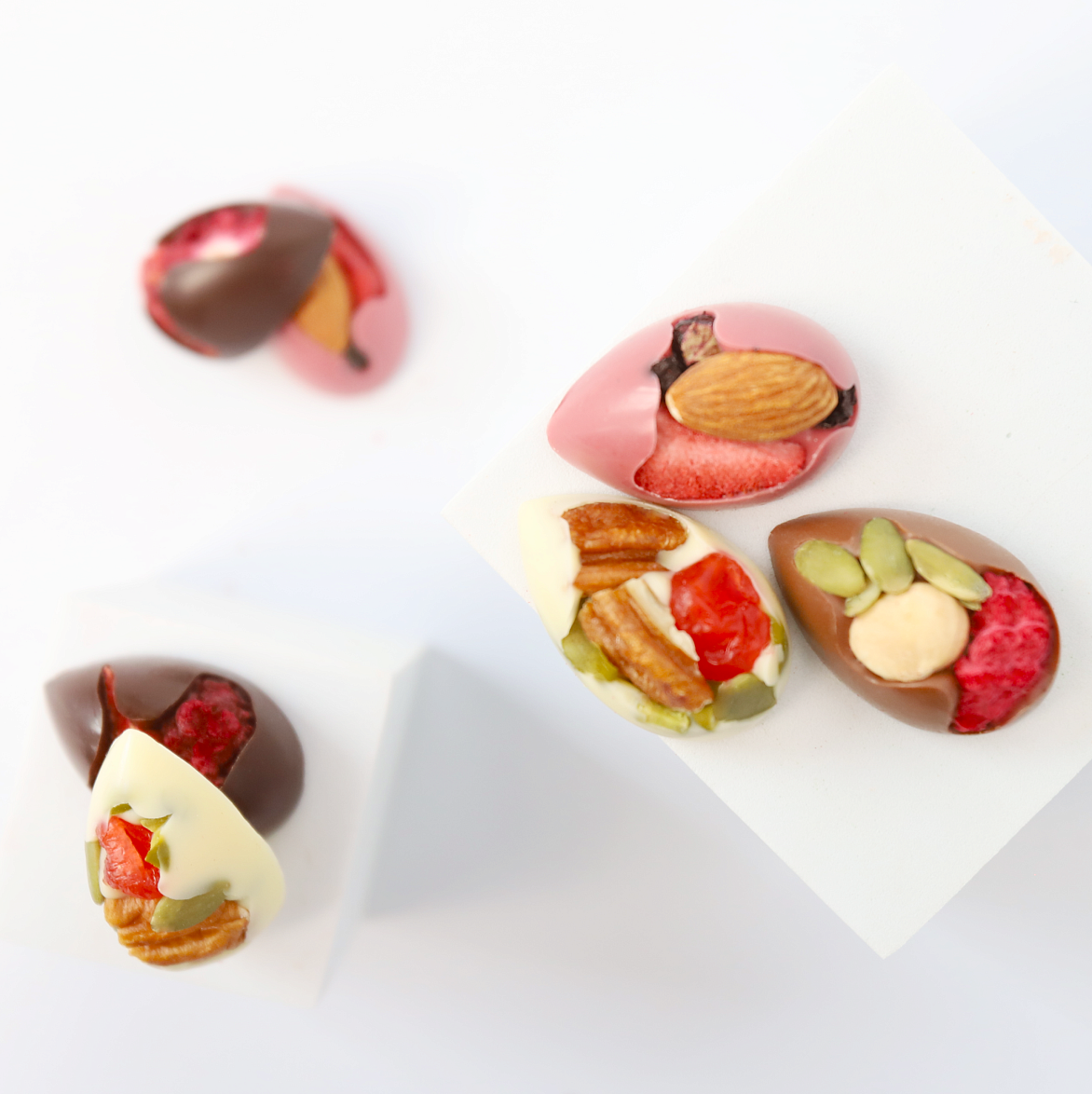 Молочный, тёмный, белый и рубиновый шоколад, фундук, пекан, фисташки, вяленая клюква, тыквенные семечки, сублимированные ягоды: малина, клубника и ежевика, пищевые добавки, натуральный ароматизатор «Ваниль»