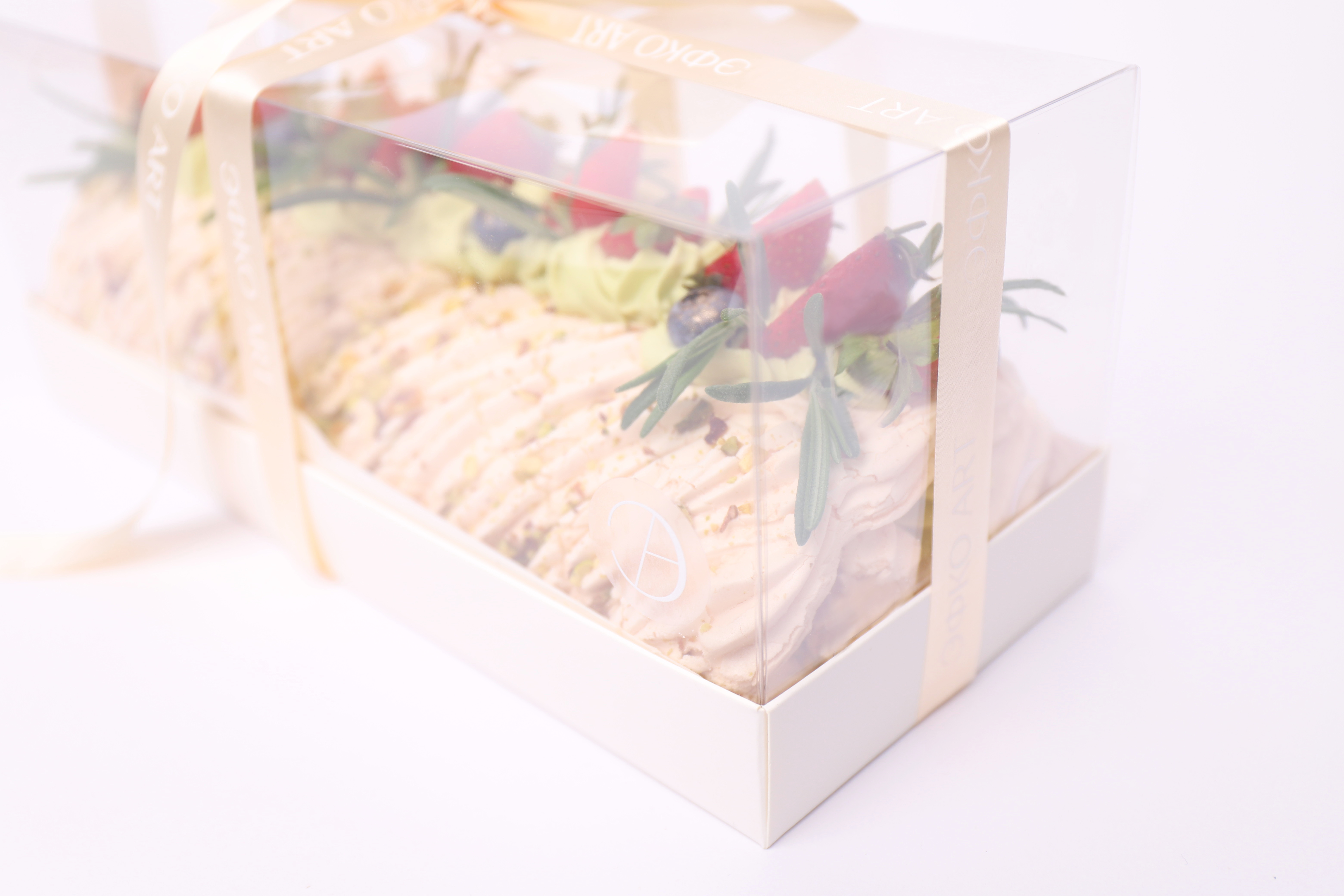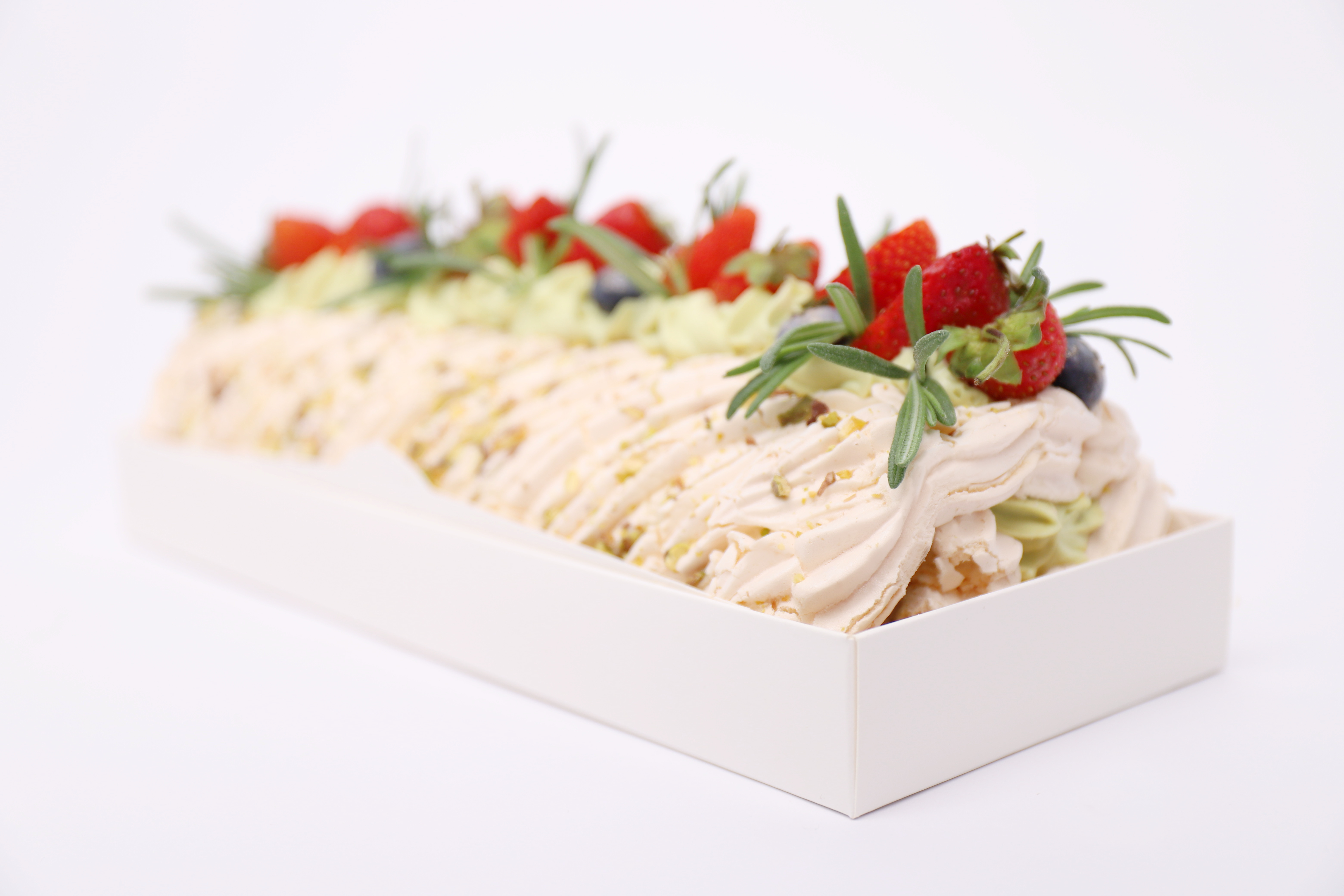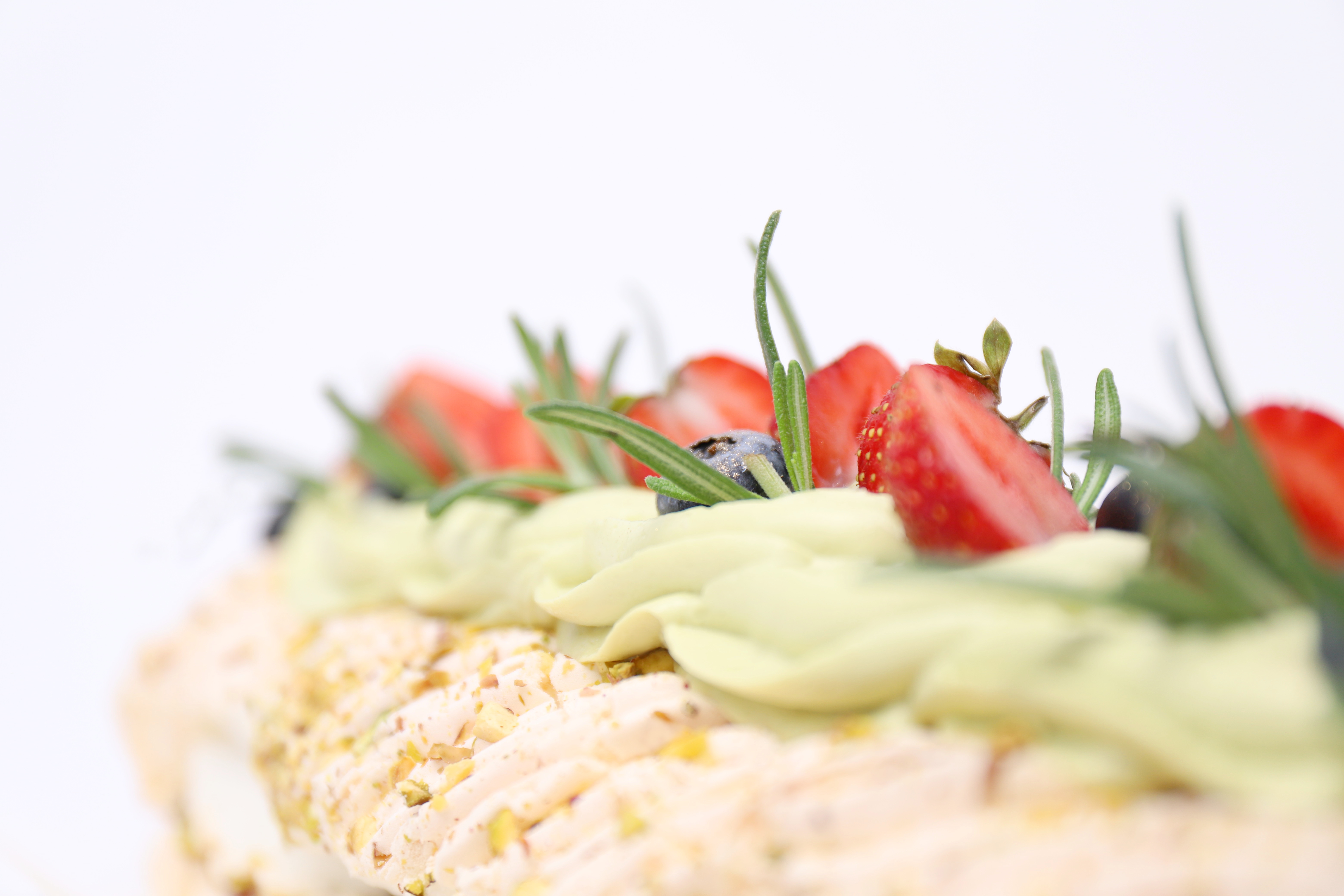 Нежная меренга, творожный крем и ароматная малина. Дополнительную изюминку придаёт фисташковый мусс.